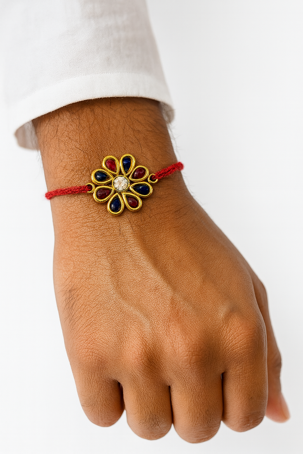 Designed in a graceful floral pattern, this handmade rakhi features a glowing maroon and deep purple stone arrangement set in fine 22K gold-plated kundan work. The radiant color palette evokes royalty and warmth, while the red thread wrapping ties the rakhi back to sacred tradition.